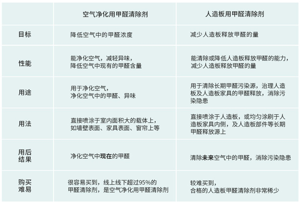 站在用戶的角度來看,空氣凈化用甲醛清除劑和人造板甲醛清除劑最大的區別就是:一個是在凈化空氣中現有的甲醛,一個是在鏟除空氣中未來的甲醛。