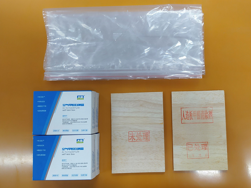 兩塊七厘板,一塊用人造板甲醛清除劑處理過(guò),一塊沒有處理過(guò),將這兩塊板分別放入自封口的塑料袋中,密封2-6小時(shí)。然后再分別放入甲醛自測(cè)盒,30分鐘后就能測(cè)得兩塊板子釋放出來(lái)的甲醛含量。通過(guò)這個(gè)簡(jiǎn)單的方法,就能驗(yàn)證人造板甲醛清除劑是否有效。