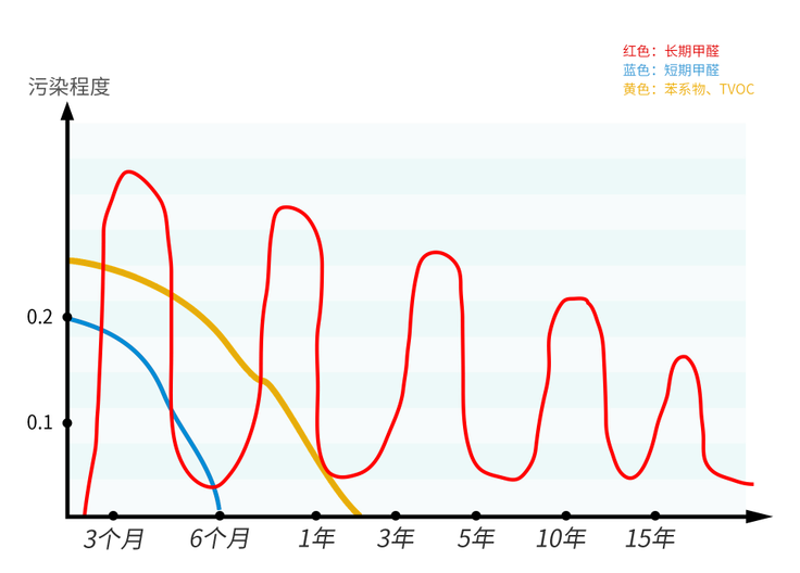 甲醛釋放持續且起伏較大,不同時間、環境條件下污染程度不同