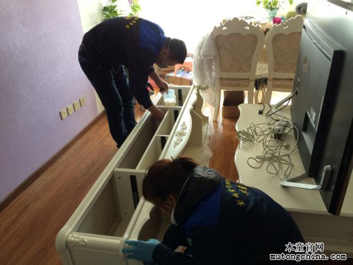 室內(nèi)由于大多都是歐式風格的家具,所使用的基材大多都是密度板,在家具的隱秘處找到了多處甲醛污染釋放源,使用我們專利技術(shù)的人造板
